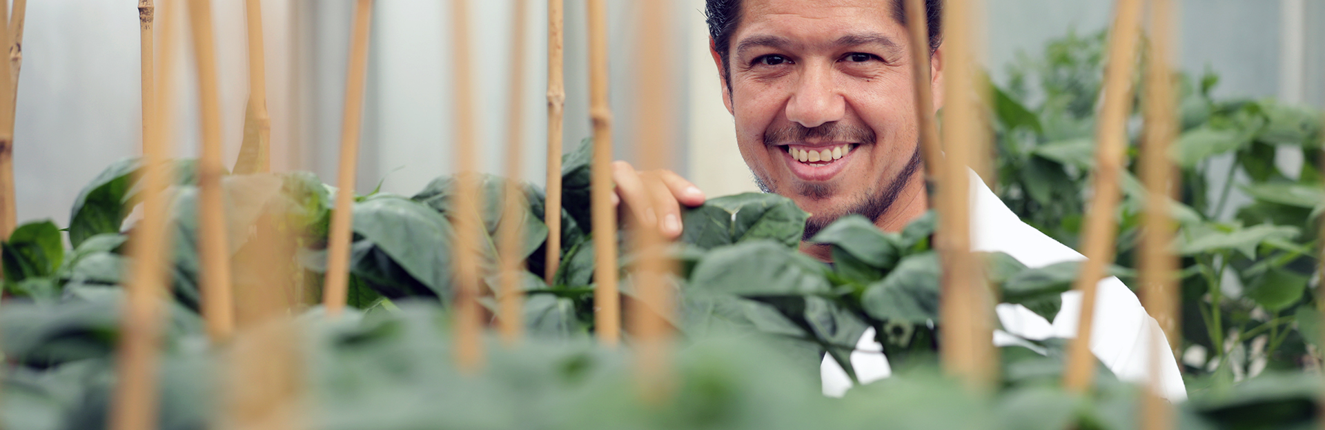 researcher in the greenhouse with plants